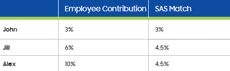 A: Samsung matches 100% of the first 3% you contribute, and 50% of the next 3% you contribute (applies to pre-tax or after-tax, but not both) for a maximum SAS contribution of 4.5%. Please note, if you reach your 401(k) contribution limits before the end of the year, Samsung will no longer contribute.