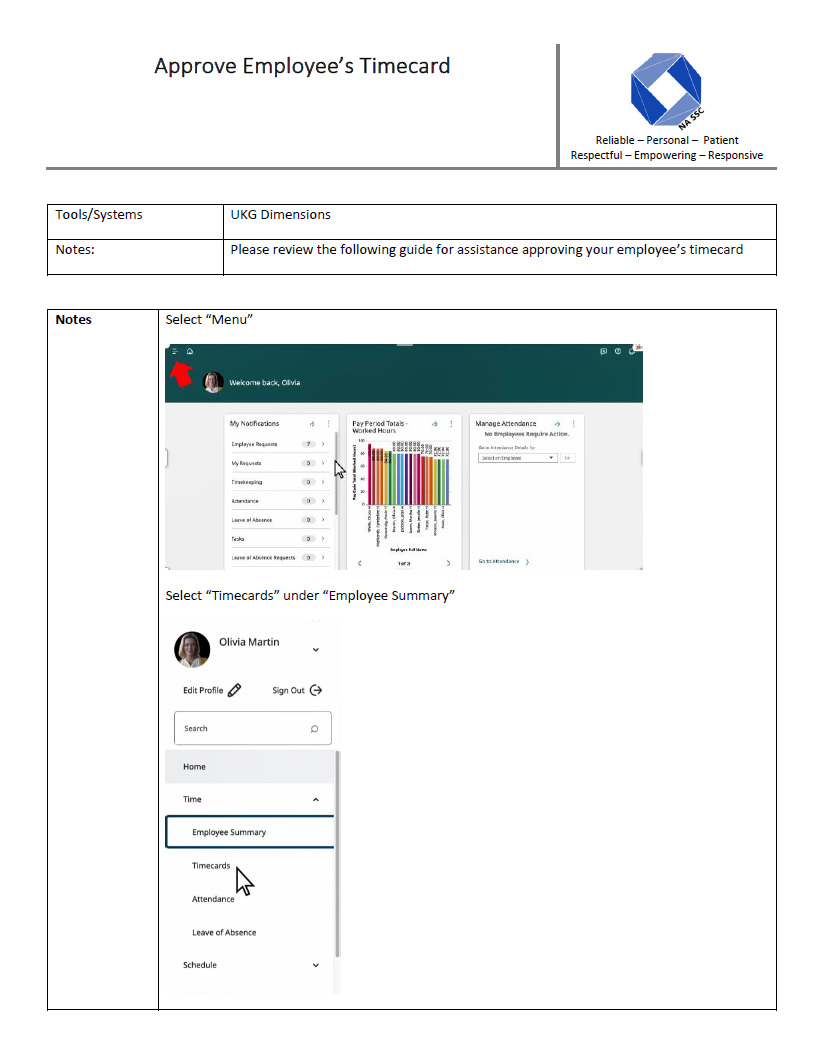 Approving an Employee's Timecard Updated October 27, 2025 23:22 Please see the attached guide on how to approve an employee's timecard. Related to timecard dimensions UKG
